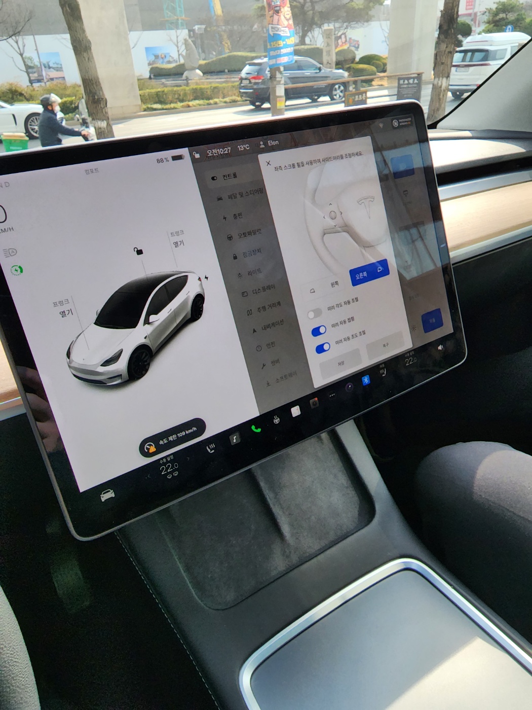 그리고 테슬라의 백미는 자율주행입니다. 자율주행 모드를 설정하면 앞차와의 거리까지 설정이 가능하고 깜빡이를 인식해서 좌우로 차선 변경과 코너를 돌아가는 것도 가능했습니다. 가속페달에서 발을 떼었을 때 브레이크가 걸리는 것은 여느 전기차와 마찬가지였지만 테슬라가 좀 더 강하게 브레이크가 들어가는 느낌이었습니다.